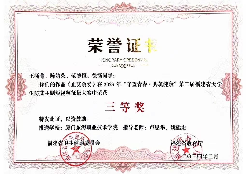 2023年,在“守望青春 共筑健康”第二届福建省大学生防艾主题短视频征集大赛赛项中,由卢思华、姚建宏老师指导的王涵青、陈婧荣、范博恒、徐涵同学在本次省赛中脱颖而出,荣获三等奖。
