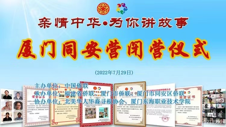 由中国侨联主办,福建省侨联、厦门市侨联、同安区侨联承办,北美华人华裔寻根协会和厦门东海技术学院共同协办的2022年“亲情中华•为你讲故事”厦门·同安特色网上夏令营于美国东部时间7月29日21:00和北京时间7月30日9:00同步圆满落下帷幕了。来自同安区侨联全体人员、北美华人华裔寻根协会领导、厦门东海职业技术学院领导及任课老师、夏令营班主任及义工老师、营员家长和59名美国、菲律宾、马来西亚、加拿大华裔青少年们一起通过线上直播平台方式参加闭营仪式。
