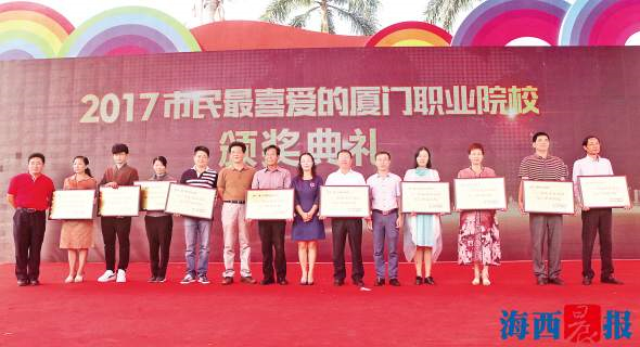 10月28日上午,“2017市民最喜爱的厦门职业院校”颁奖典礼在厦门白鹭洲音乐广场举行。民进厦门市委主委吴丽冰、厦门市中华职业教育社副主任翁玉华、民盟厦门市委秘书长王东良以及海西晨报社副总编辑陈炜明莅临典礼现场,并为获奖学校颁奖。