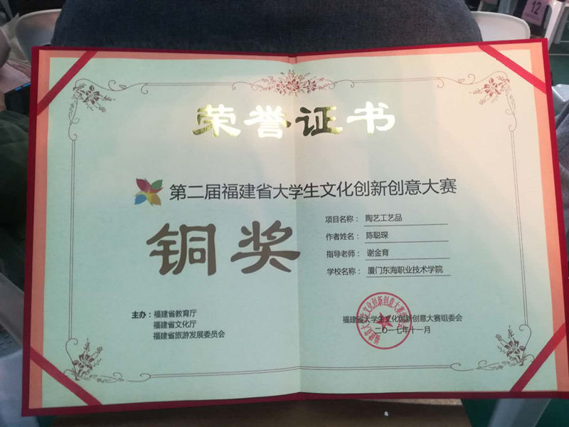 2017年11月24日,福建省教育厅联合福建省文化厅、福建省旅游发展委员会主办了“第二届福建省大学生文化创新创意大赛”,传媒与艺术学院的“陶艺工艺品”项目荣获该比赛的铜奖。