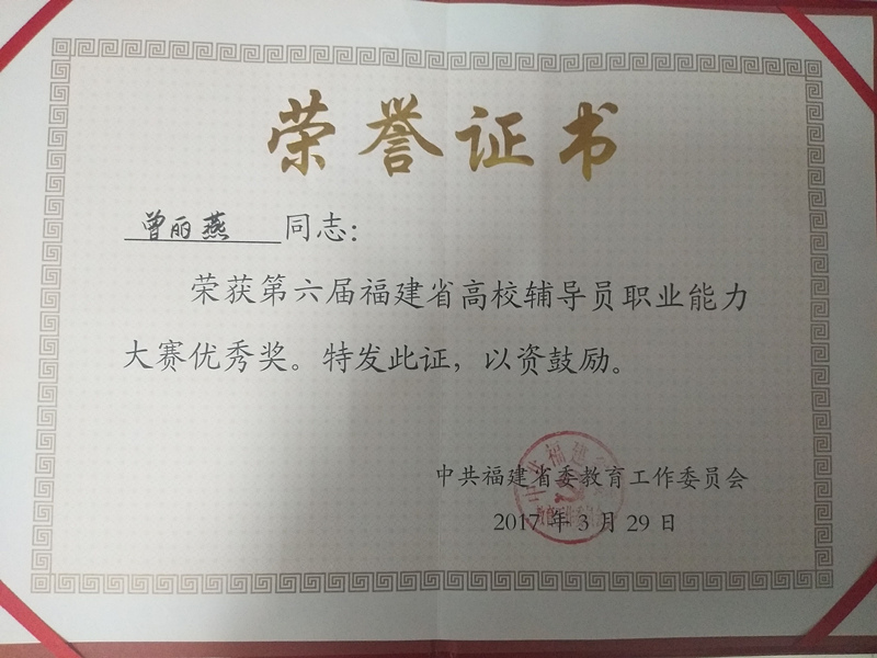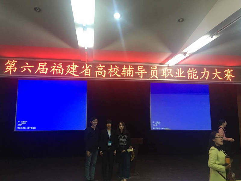 2017年3月28日省第六届辅导员职业能力大赛于福建师范大学旗山校区举行,此次比赛的参赛人员来自其他高校71位优秀辅导员。为了以赛代训、以赛代练,进一步推进辅导员队伍专业化、职业化建设,我校通过多次筛选,推荐曾丽燕老师参加此次比赛,王巧明、唐东旭前往比赛现场观摩。经过激烈角逐,我校曾丽燕老师获得“优秀奖”佳绩。