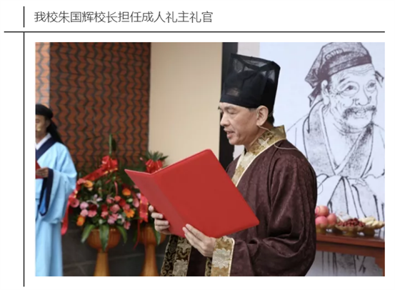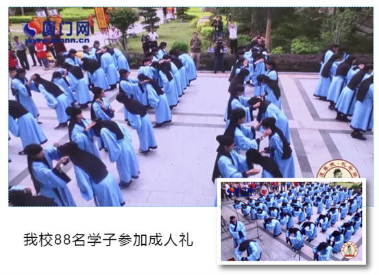 鉴于我校师生去年在朱熹绍熙州县释奠仪的出色表现,我校今年受邀安排88名学生干部承接成人礼。随着鼓乐声响起,我校朱国辉校长带领我校88名学子身着汉服肃穆而立。在众人的见证下,担任主礼官的朱校长陪同受冠者、加冠、行醮子礼、赐字,以这样传统的方式步入成人的行列。同时,其他两所学校两个分会场各有400名学子,参与此次成人礼。此次活动共计888名学生纪念朱熹诞辰888周年。这场成人礼主要以朱子《家礼》所记载的冠礼为蓝本,根据现代推广需要改良而来,让朱子成人礼重放光彩。