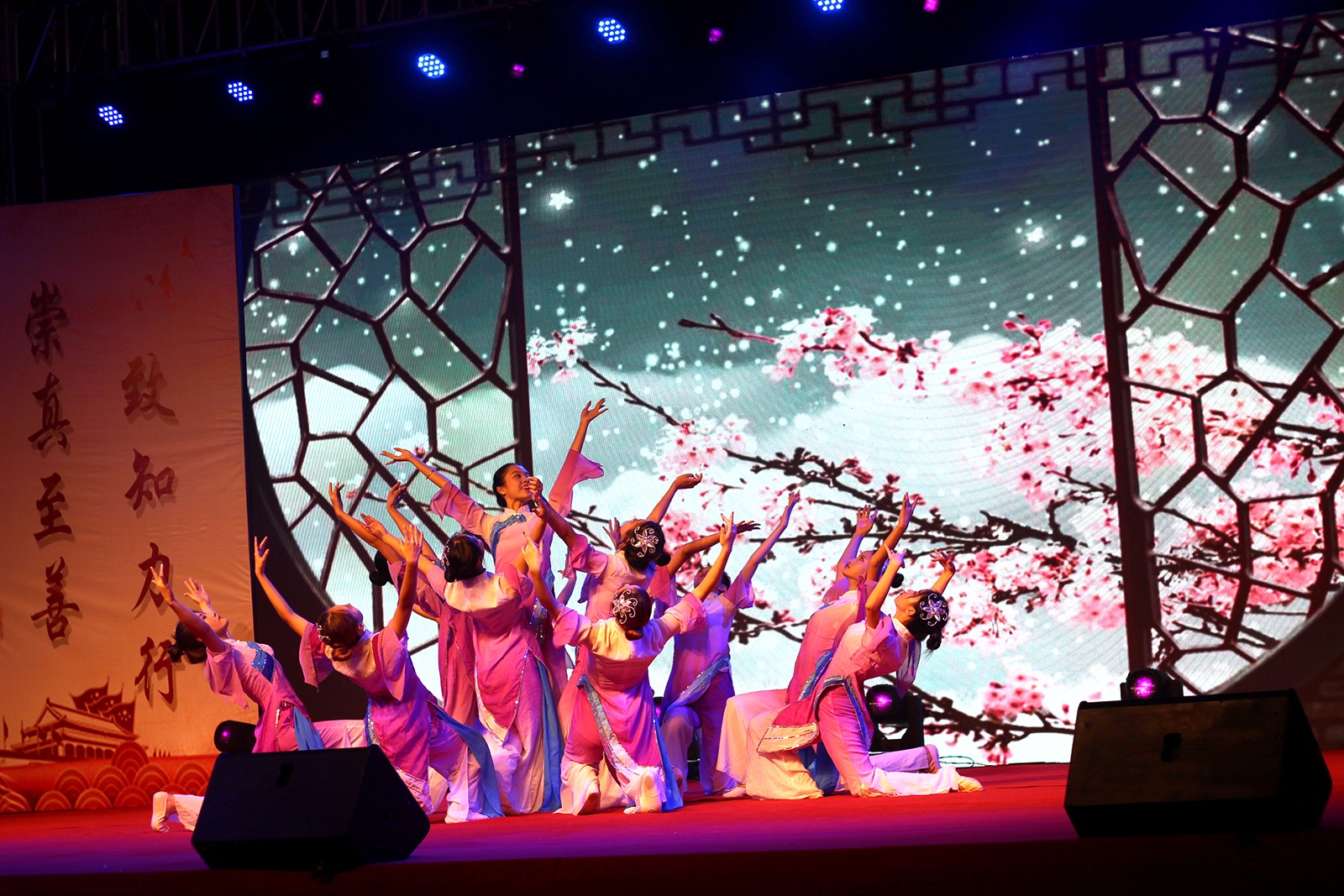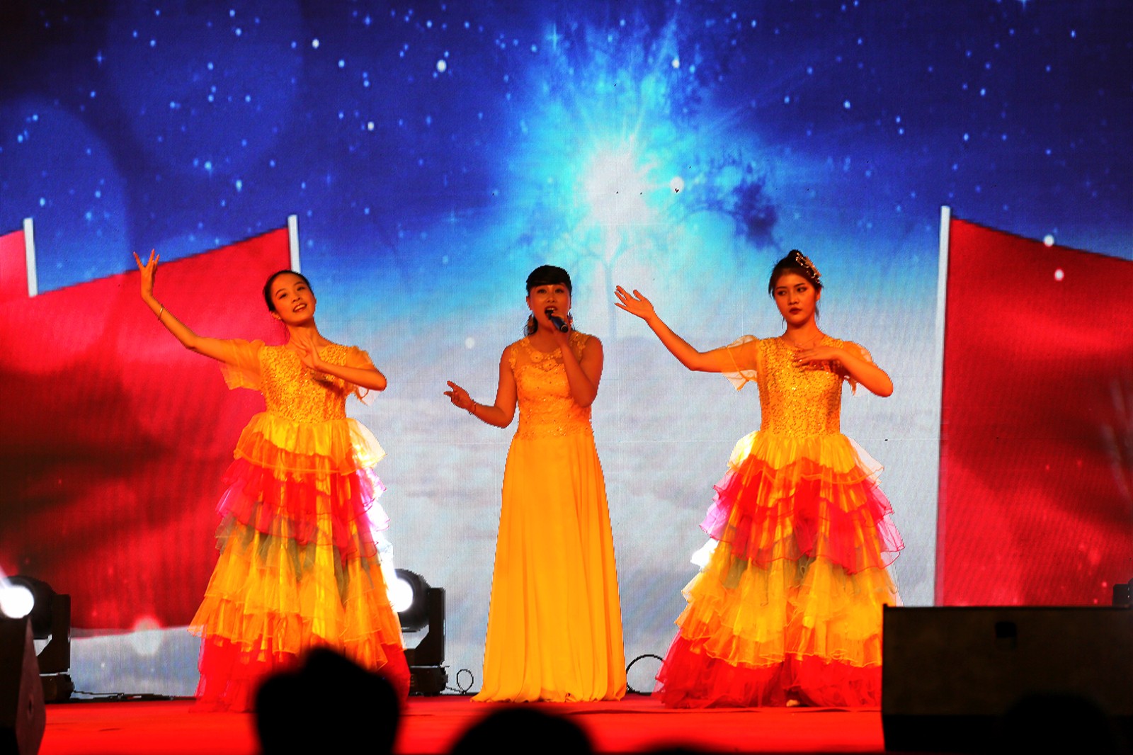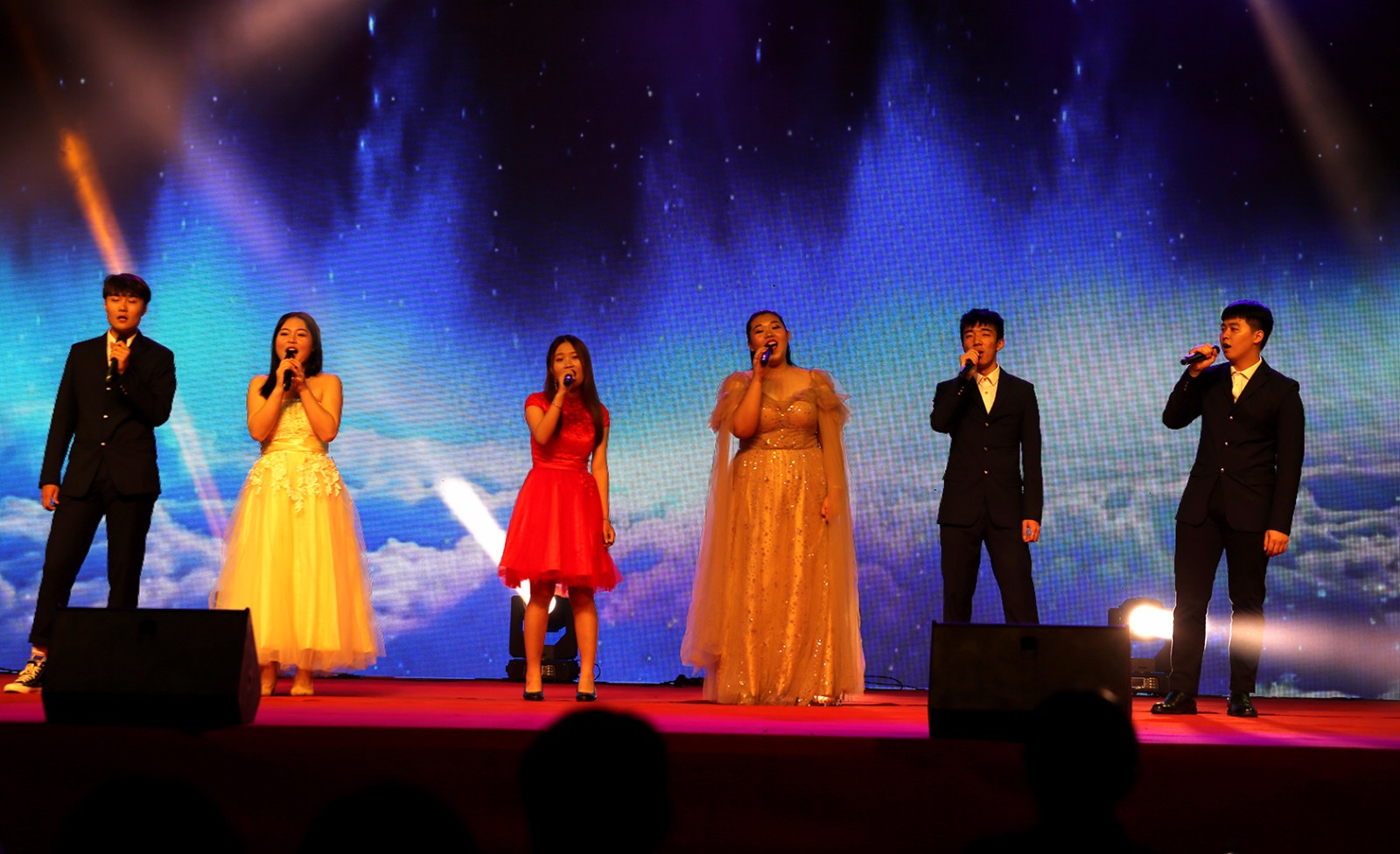 晚会在乐队演唱《龙的传人》中拉开帷幕,随后多才多艺的新生联袂献上舞蹈串烧和歌曲串烧。小品 《创业家族》带来阵阵欢笑;舞蹈《梨花又开放》和《傣悸》表达了浓浓的思乡情和民族特色;舞蹈《芒种》将中国元素和现代爵士进行了巧妙的融合;校林玲玲老师携手艺术团学生带给大家的歌伴舞《我的中国梦》和《我和我的祖国》将晚会推上了高潮;辅导员抽空编排的《小幸运》让场下同学激动万分,呐喊声此起彼伏。晚会在全场齐唱《歌唱祖国》中落下帷幕!