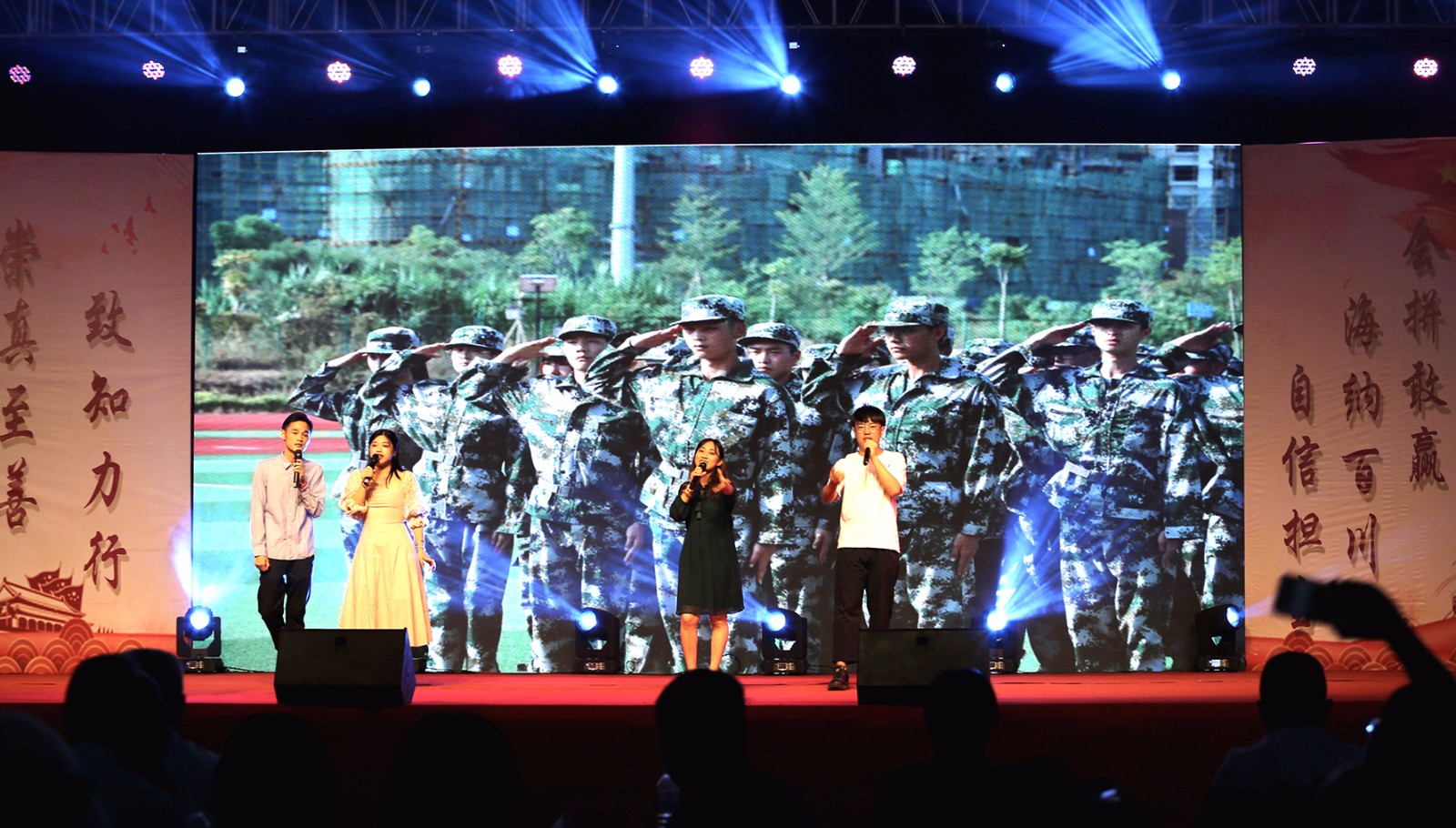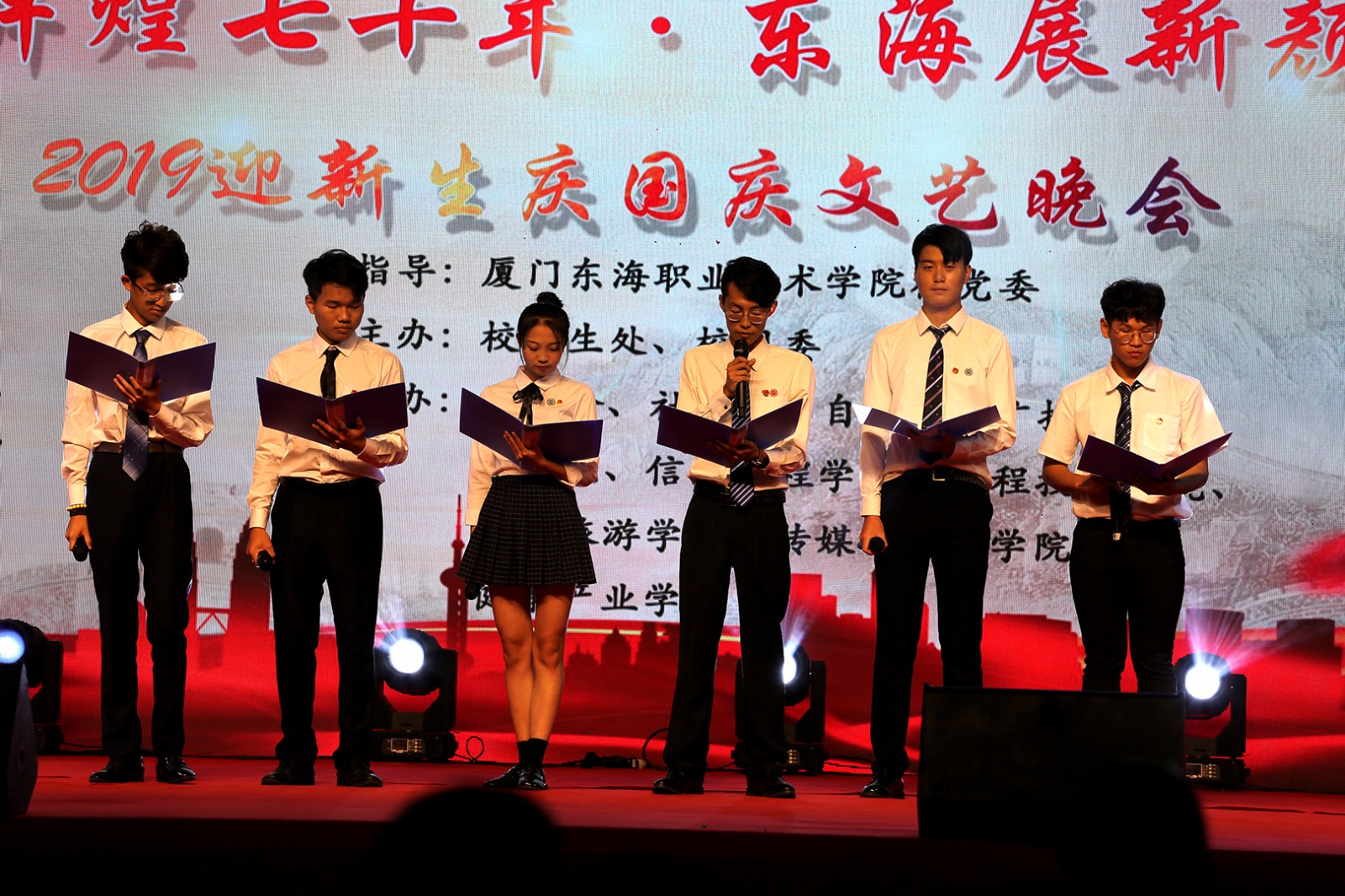 回望壮阔70年,见证中华之崛起!生在盛世,不忘中国梦!为迎接新中国成立七十周年,9月25日晚在我校中庭广场举行“辉煌七十年·东海展新颜”迎新生庆国庆文艺晚会。学校校长来永宝教授、校党委黄平南书记、学校林金龙副校长、中国移动公司同安分公司副总经理庞丽萍、中国移动公司同安分公司高校区域总监陈巍巍、福建省海峡职业技术学校揭礼铭校长及我校各二级学院、各处室领导莅临晚会现场!