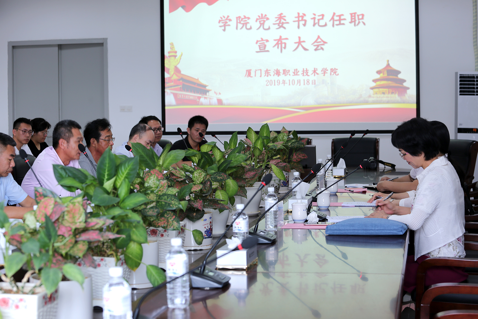 10月18日上午,我校召开干部大会,宣布市委关于陈前同志任厦门东海职业技术学院党委书记的决定。中共厦门市委教育工委副书记施琦婷,中共厦门市委教育工作委员会副巡视员、组织处处长李燕娜,同安区委组织部副部长郑志献等有关领导出席会议。校董事会董事长吴泉水、财务总监陈有才以及学校党政领导班子成员、中层干部参加了会议。厦门市委教育工作委员会组织处处长李燕娜主持会议。