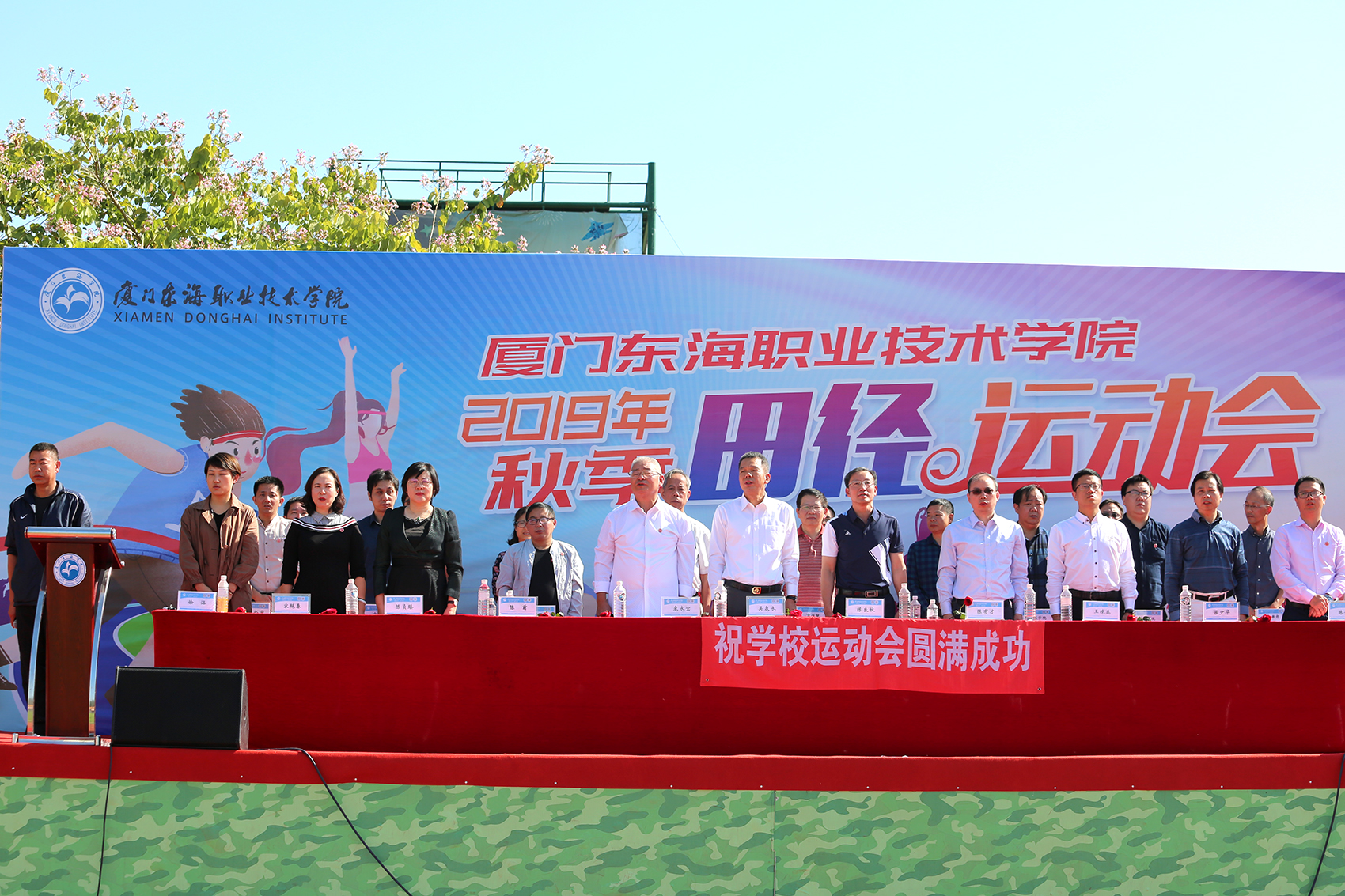 11月15日上午,东海学院2019年秋季田径运动会隆重开幕。泉舜集团董事长吴泉水、副董事长兼首席运营官陈良秋、财务总监陈有才、总裁助理王境泰、行政法务部总经理陈贞臻、教育事业中心副总经理梁少华,学校党委书记陈前、校长来永宝、副校长宋艳春、副校长林金龙,与全体师生欢聚一堂,共襄盛举。仪式由学校陈前书记主持。
