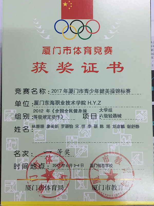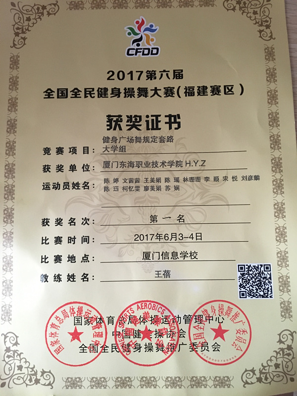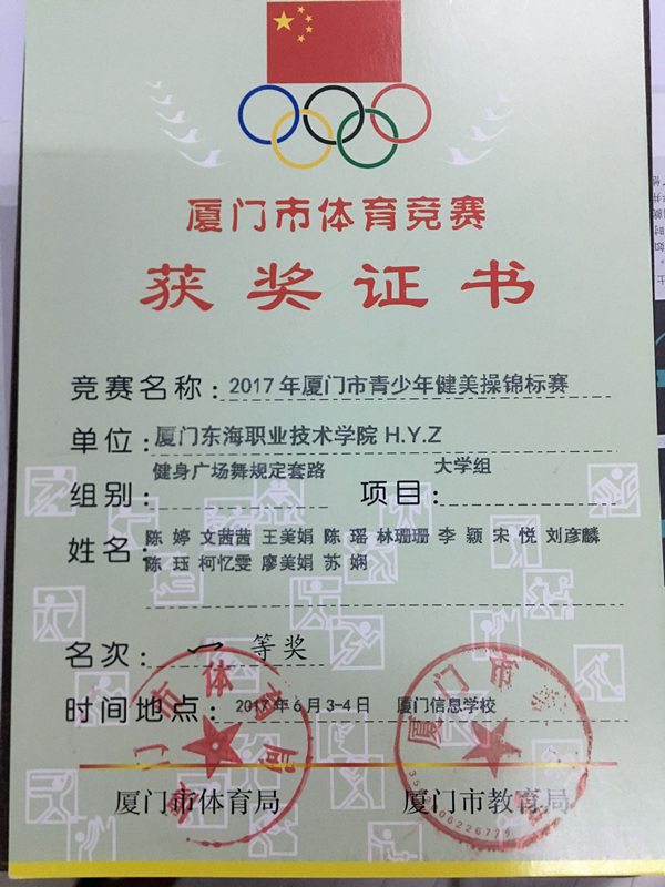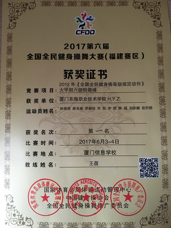 由厦门市教育局、厦门市体育指导中心主办的2017年厦门市青少年健美操锦标赛6月3-4日在厦门信息学校举行。在王蓓老师的指导下和同学们的努力下,最终荣获大学组六级轻器械一等奖、大学组健身广场舞规定套路一等奖;同时授予2017第六届全国全民健身操舞大赛(福建赛区)健身广场舞规定套路第一名、2012年《全国全民健身操登记规定动作》大学组六级轻器械第一名的殊荣。