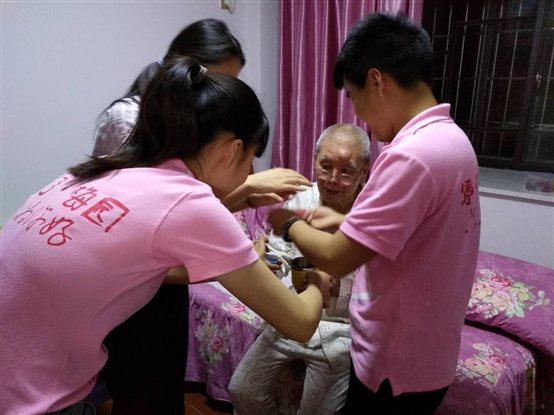 在本次的养老护理志愿者行动中,2016级老年服务与管理班的同学们在庄伊洢老师的带领下对伍心养老院进行了参观学习,之后又在学长的指导下对各种护理护具进行试用;在充分的了解和准备后,根据养老院方的安排开始了志愿者服务。同学们结合《老年护理学》《基础医学》《老年心理护理》 等等所学知识结合实际对老年人进行用餐护理、心理护理、健康护理等。在志愿者行动过程中,同学们发扬不怕苦不怕脏不怕累的革命精神,在服务中验证自己对专业知识掌握程度,对本专业有了直观的印象,对职业教育有了更积极的了解。