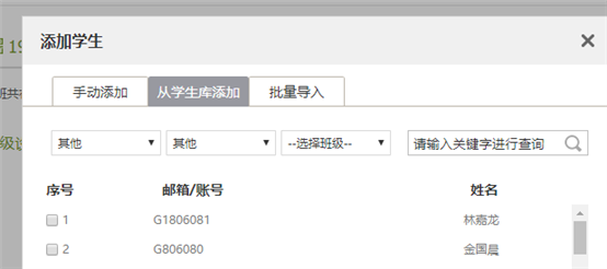 目前我校学习通已经导出所有在校生的数据,大家只要直接添加学生-:>从学生库添加à选择学院—专业—班级进行添加。