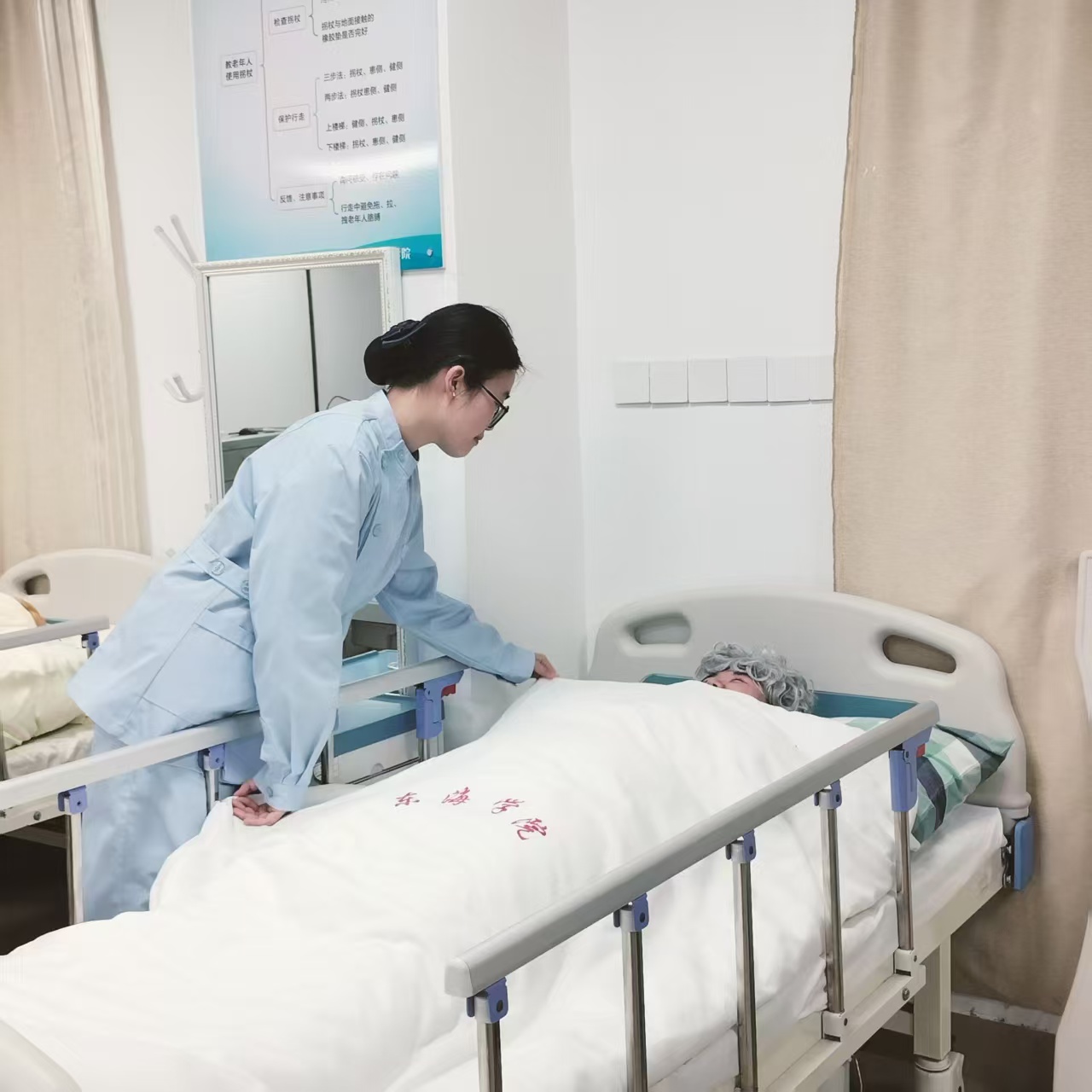 老年护理实训室于2025年建成,致力于通过场景仿真和实验实训,提升智慧健康养老服务与管理专业学生的实操技能,使其更快更好地掌握针对老年人的专业护理技能。