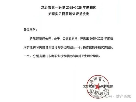 添加时间:2025-09-22我校健康产业学院2023级护理专业陈钰娴、张叶红、朱欣欣、丘铭锋、温鑫彤、倪嘉辉、杨子晗、李坤钰八位同学在龙岩市第一医院实习期间,他们凭借扎实的专业技能、优良的职业素养和无私的奉献精神脱颖而出,获得龙岩市第一医院护理部的公开表彰,这份荣誉不仅是对个人能力的认可,更是我校护理专业人才培养成果的生动体现!