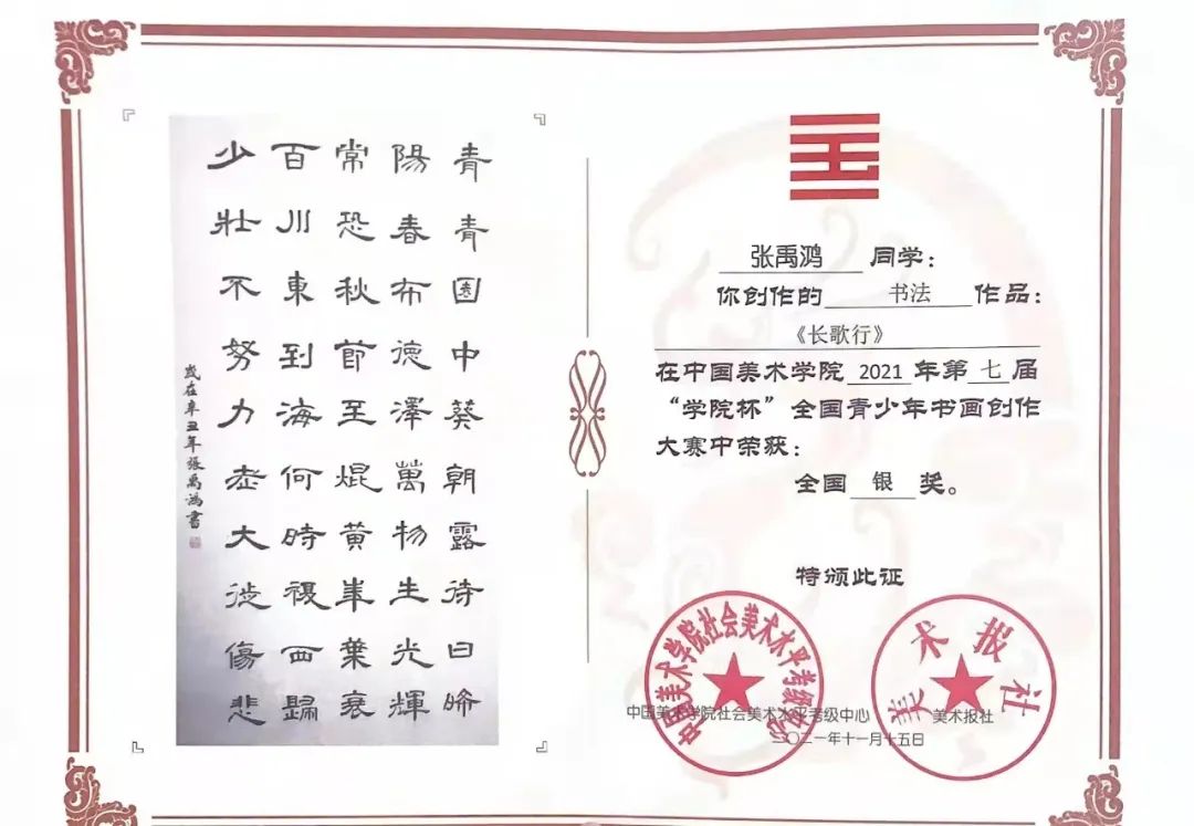 我院积极培养学生各方面兴趣爱好,支持学生朝多方面发展。此次大赛经过近5个月的征稿,来自全国各地的6万余人进行了激烈的比拼,教师教育学院2021级学前教育9班张禹鸿利用课余时间进行刻苦练习,并通过了专家评审的层层选拔,凭借用笔精湛、字字精美的书法作品取得了全国银奖的佳绩,为学院赢得了巨大的荣誉。此次大赛获奖作品将在福建多个地市权威专业的美术馆进行巡回精品展览。