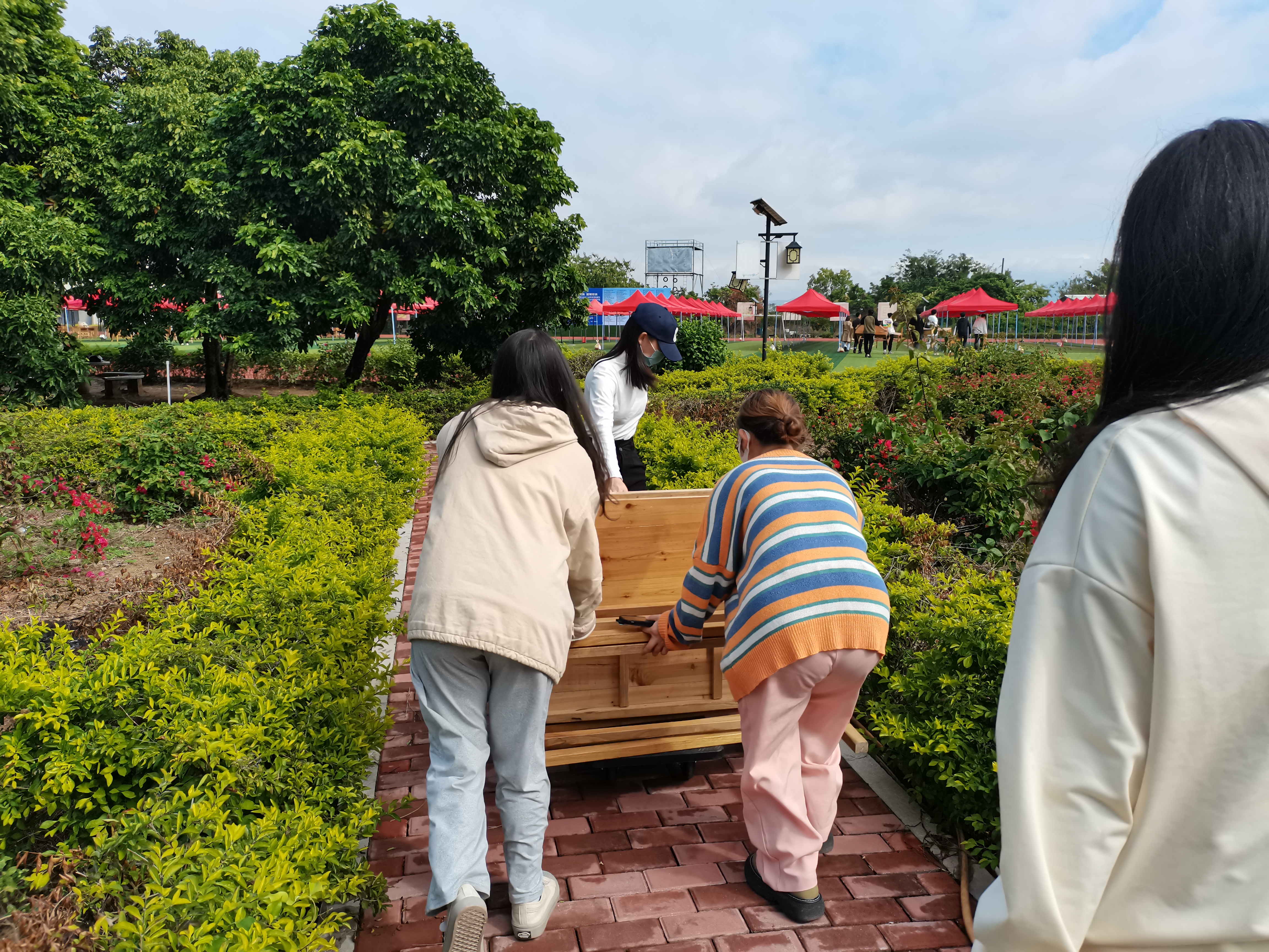 (校园招聘会团总支人员帮忙运输桌椅)