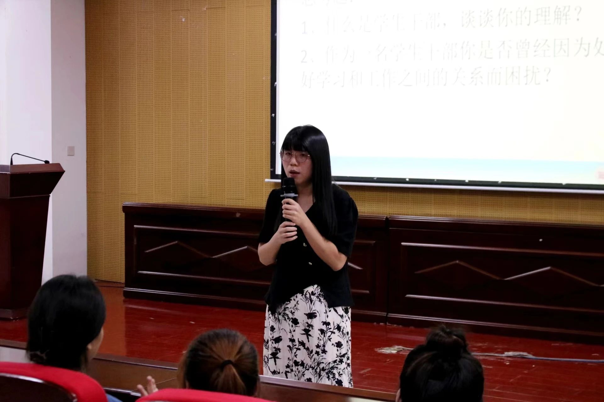 曾丽燕老师分别从学生干部如何处理好学习与工作的关系、如何处理好老师与同学的关系、如何处理好管理与服务的关系三个方面着重为大家梳理了各因素之间的联系。同时,鼓励学生干部们仰望星空,脚踏实地。作为新时代的大学生,要结合自身实际情况,树立奋斗目标,夯实专业知识,提升专业技能,在做好生涯规划的基础上,珍惜每一次学习和历练的机会,积极投身于高校学生工作的事业中,将小我融入大我,将自己的成长融入学校的建设发展中,融入中华民族伟大复兴的战略全局中,为中国特色社会主义事业贡献自己的青春力量。