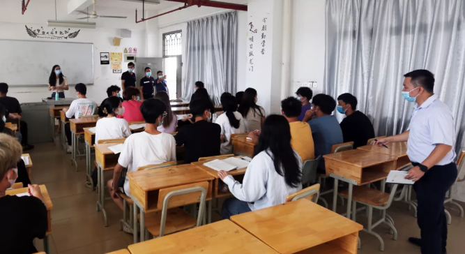 经历了“虽短暂却又漫长”的等待,迎着秋天的微风,团聚的日子悄然而至。在确保防控安全的前提下,10月11日,我们迎来了线下复课的第一天。沉寂许久的校园,恢复了往日的生机,抬眼所见是手捧书卷的身影,耳边传来是琅琅的读书声。解封不解防,为确保全校师生学习生活的健康安全及教学工作的顺利开展,校长叶光煌、副校长郭士正、副校长林金龙、校长助理赵建业携教务处、学生处、质管办、信实中心等部门负责人对教学工作及课堂情况进行了巡视。