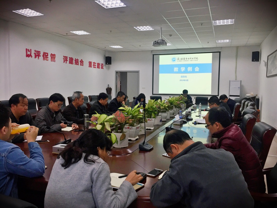 我校于2019年03月05日思源楼会议室召开期初教学例会。朱国辉校长、教务处副处长赵建业、廖贵强、教学质量管理办公室副主任邹胜龙、实验管理中心负责人陈志新以及各二级院(部)教学院长、秘书与会,会议由廖贵强副处长主持。