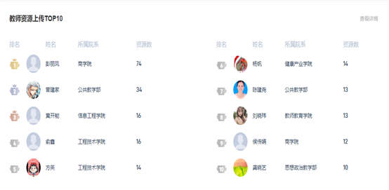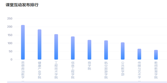 根据教学平台数据,本周线上活跃课程数191、新建课程数1、运行班次948;有168名教师完成线上教学任务,上线学生人数3551,学生应签到数23218,完成签到人次21206,全校学生到课率91.33%,比上周有所增长;平台师生活跃次数为82707,教师活跃次数为5224、学生活跃次数为77483;课堂互动发布次数1234,互动项目数量前三名为课堂提问227次,主题讨论161个,课堂抢答105个,参与人次达3970;课堂互动前三名的院(部)为思想政治教学部、健康产业学院、工程技术学院,课堂互动较上一周有大幅度的提升;最为活跃课程有VBSE跨专业综合实训、数据结构、应用文写作;教师上传资源总量288个,其中图片139个,视频53个,word44个,PPT43个,教师上传资源前三名为彭丽凤、曾建家、黄开能。