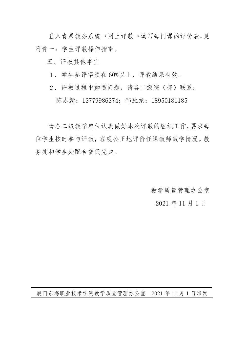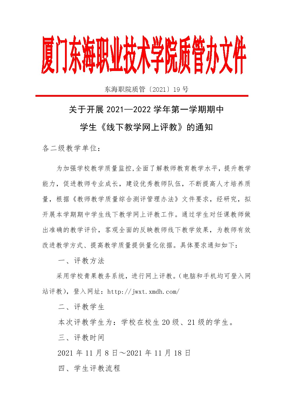 东海职院质管〔2021〕19号 关于开展2021-2022学年第一学期期中学生《线下教学网上评教》的通知