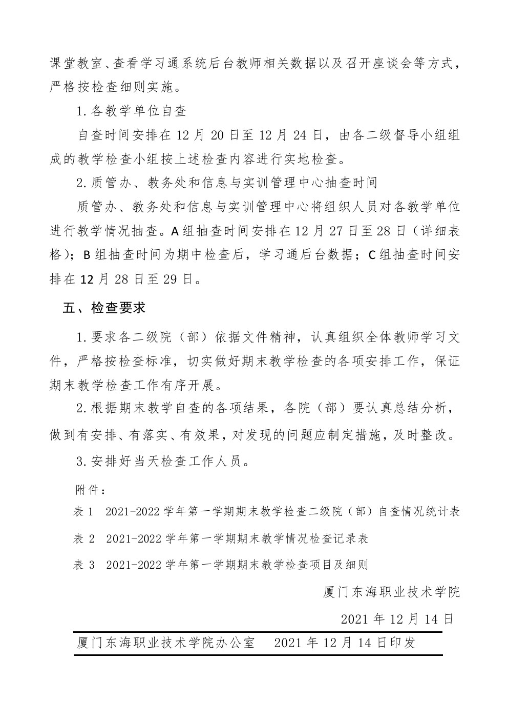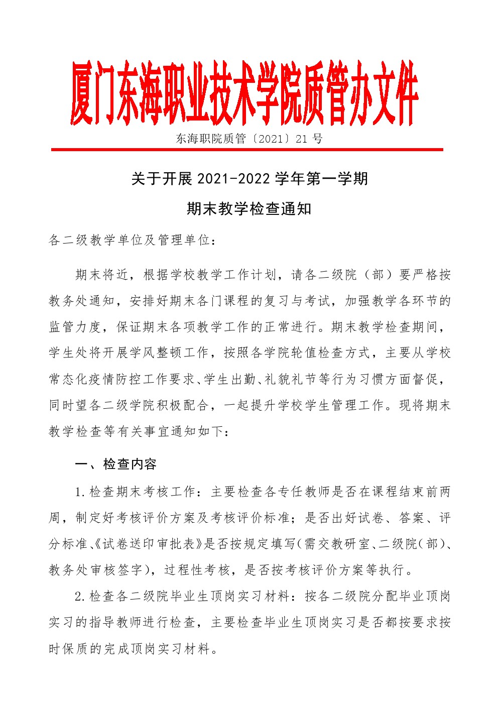 东海职院质管〔2021〕21号 关于开展2021-2022学年一学期期末教学检查通知