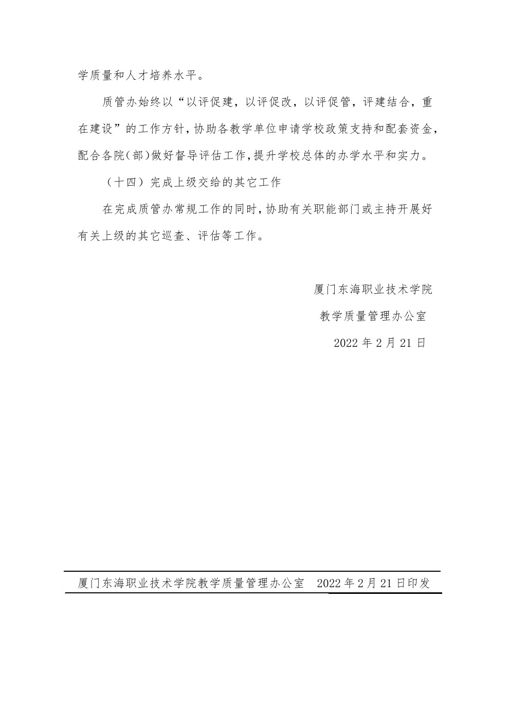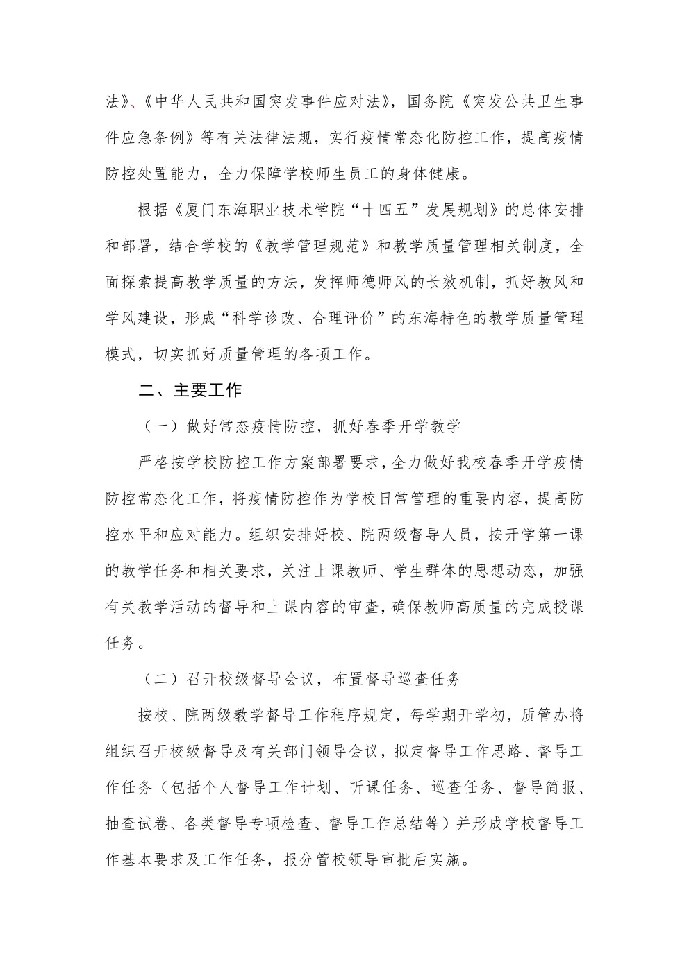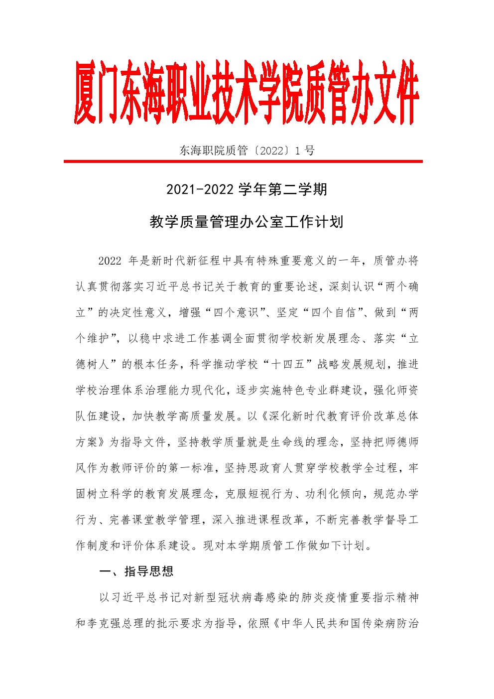 东海职院质管〔2022〕1号 2021-2022学年第二学期教学质量管理办公室工作计划
