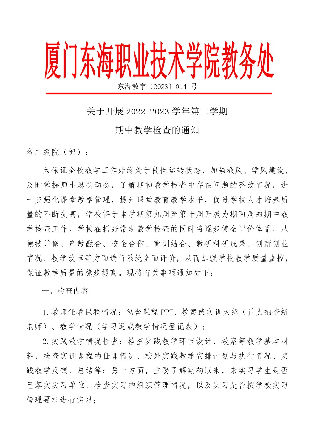 东海教字〔2023〕014号 关于开展2022-2023学年二学期期中教学检查的通知