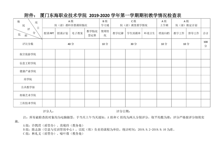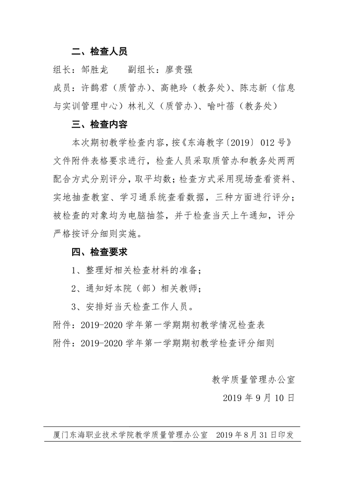 东海职院质管[2019]3号——开展2019-2020学年第一学期期初教学检查的安排