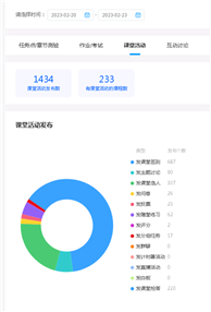 课堂活动数1434次,作业发放数量79次,作业批阅数量1662次,考试发放数量17次,教师发帖数116次。