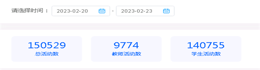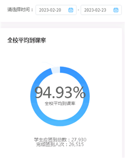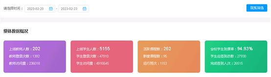 2月20日至2月23日期间,上线教师人数202人,上线学生人数5155人,活跃课程262门,新建课程数95门,运行班次1153门,学生到课率94.93%。