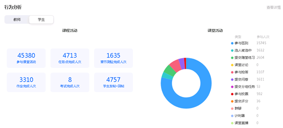 学生参与课堂活动45380次,任务点完成人次4713人次,章节测验完成1635人次,作业完成3310人次,学生发贴4757次。