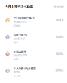 1.学生出勤率较高。开学第一天全校平均到课率为96.17%,有70个授课班级到课率达到100%,与上学期同期相比有很大的提高。例如:21学前教育1、2、3、4班、22护理2、4班、22级汽车1班22电梯1班、22级计网2班、21级酒管1班、22空乘、22级金融服务与管理、22级国际商务、22级数媒2班等班级。教师能够较好的运用学习通教学平台完成建课、签到、互动、布置作业和答疑。通过与学生充分沟通交流,让学生能够尽快收心转变心态,投入到课堂学习,各学院的辅导员都能引导和帮助学生养成良好的作息习惯,适应新的学期生活。