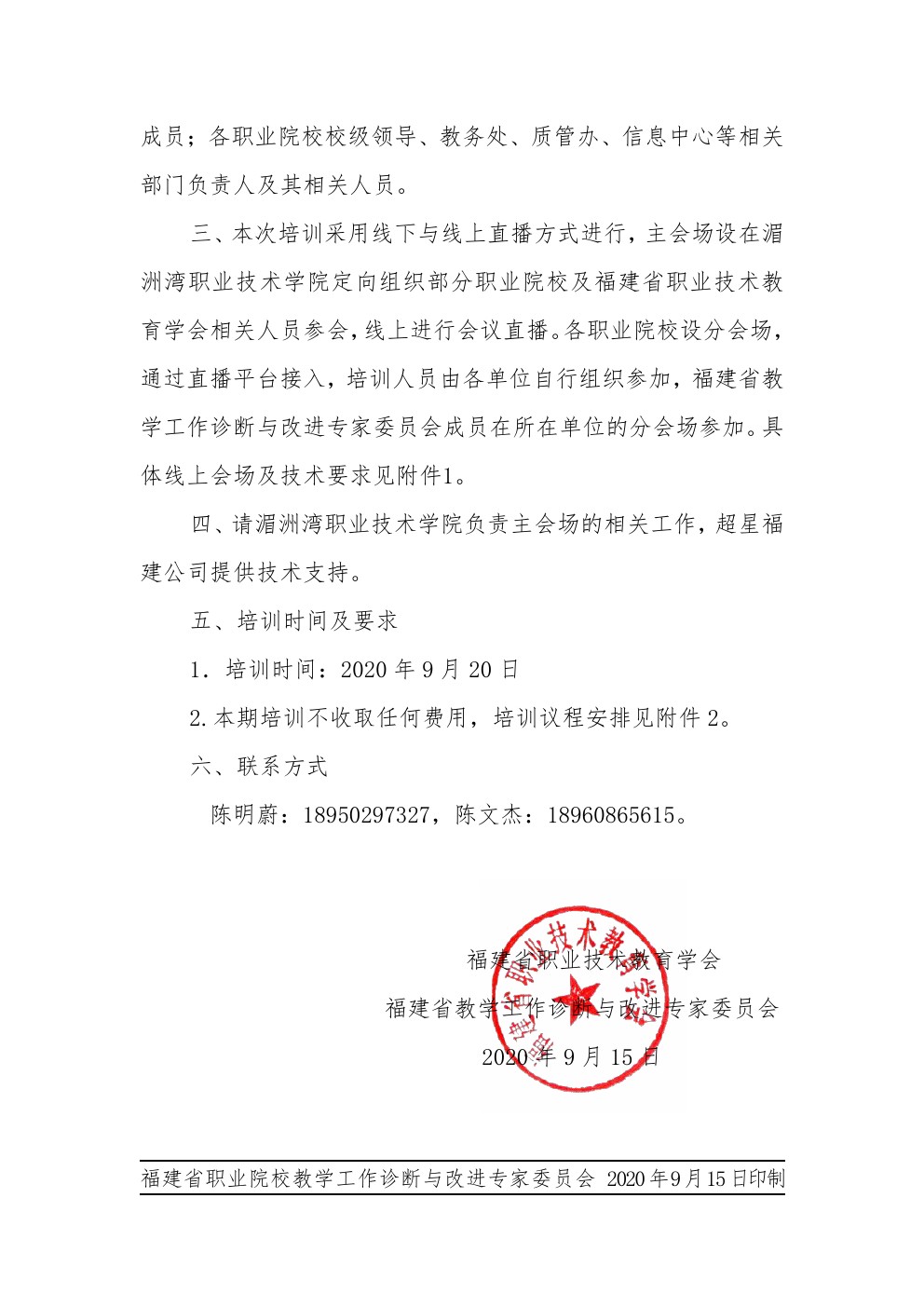闽职教诊改〔2020〕2#关于举办2020年福建省职业院校教学工作诊断与改进理论与实务专题培训的通知