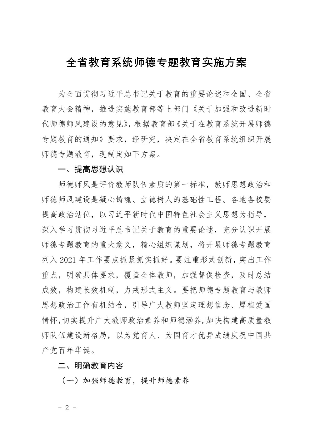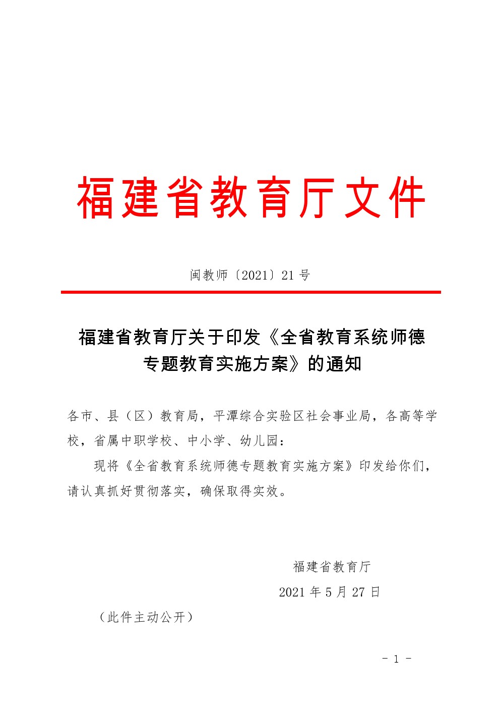 闽教师〔2021〕21号福建省教育厅关于印发《全省教育系统师德专题教育实施方案》的通知