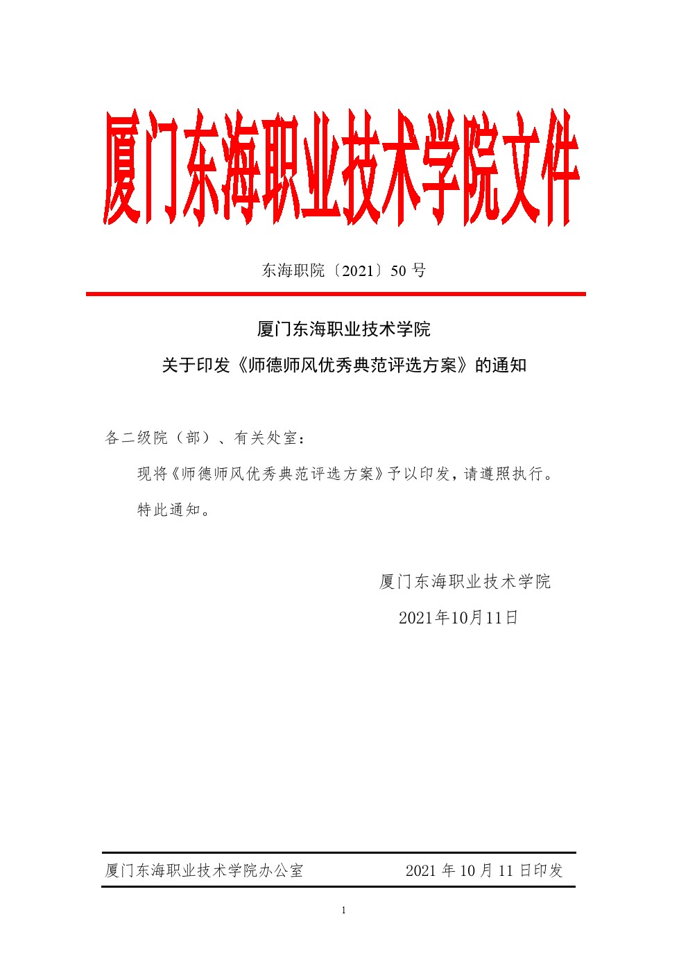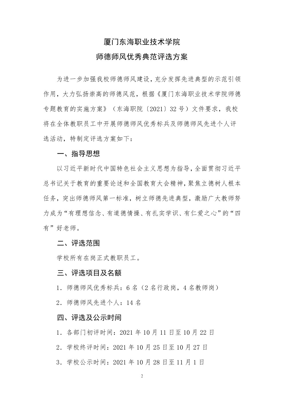 东海职院〔2021〕50号 厦门东海职业技术学院师德师风优秀典范评选方案