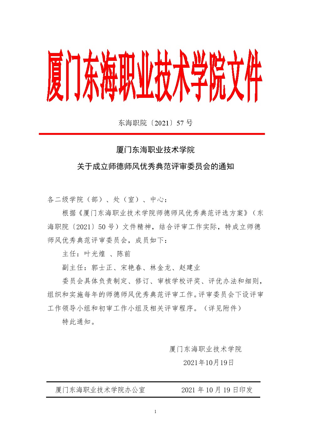 东海职院〔2021〕57号 关于成立师德师风优秀典范评审委员会的通知