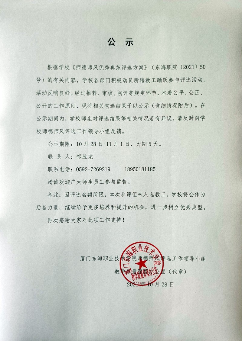 东海职院〔2021〕60号 关于公布师德师风优秀典范评选结果的通知