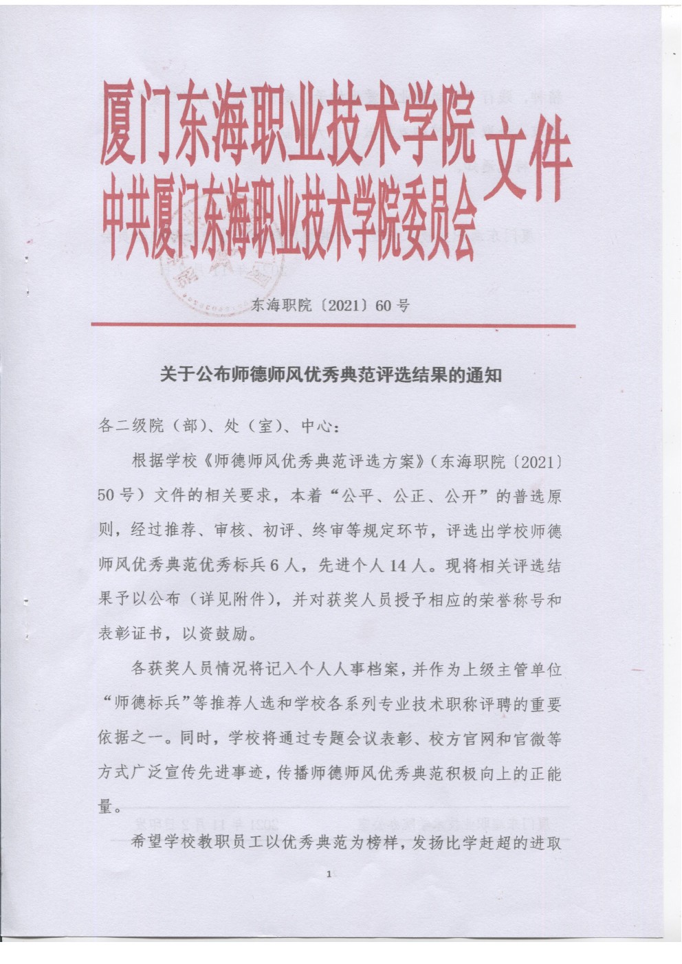 东海职院〔2021〕60号 关于公布师德师风优秀典范评选结果的通知
