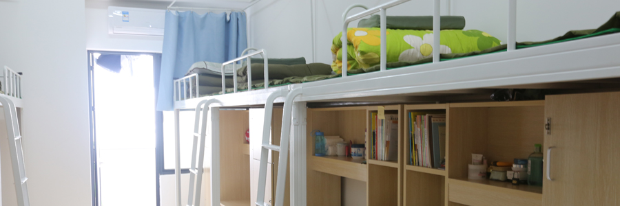 学生宿舍为6人间,家具配有床、衣柜、书柜、书桌,椅子;电器配有空调、风扇;每座楼配有自助式投币洗衣机供学生使用;宿舍楼均有电梯。