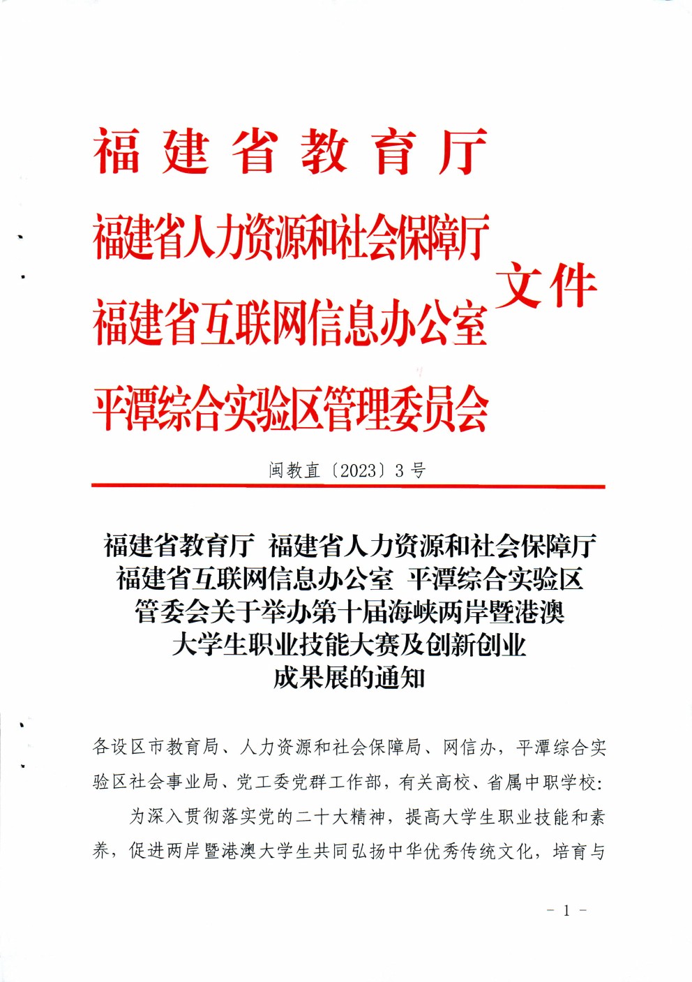 闽教直〔2023〕3号福建省教育厅+福建省人力资源和社会保障厅+福建省互联网信息办公室+平潭综合实验区管委会关于举办第十届海峡两岸暨港澳大学生职业技能大赛及创新创业成果展的通知(1).pdf