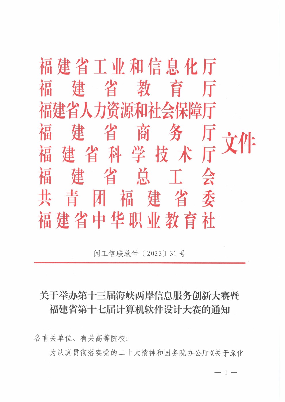 闽工信联软件〔2023〕31号 关于举办第十三届海峡两岸信息服务创新大赛暨福建省第十七届计算机软件设计大赛的通知.pdf