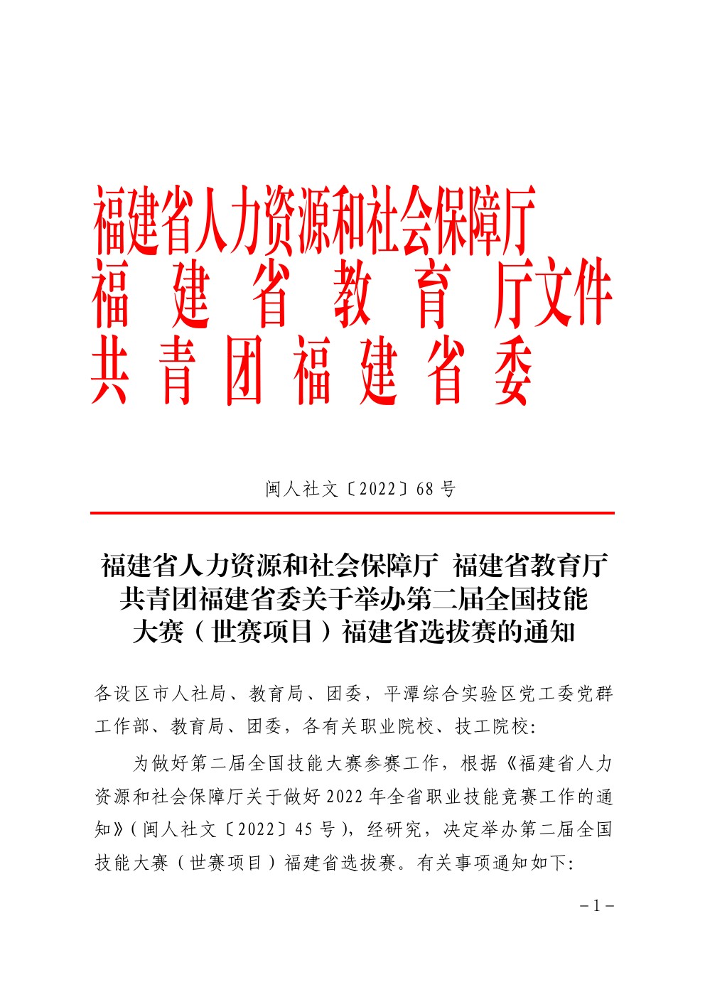 闽人社文[2022]68号 关于举办第二届全国技能大赛(世赛项目)福建省选拔赛的通知.pdf