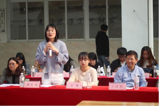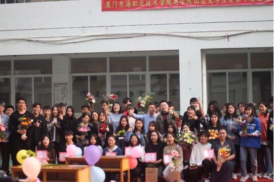 参赛代表上台就作品的寓意进行讲解,待所有组员展示完后比赛也接近了尾声,商学院团总支书记黄阿观老师为这次插花节做出精彩点评,并合影留念。
