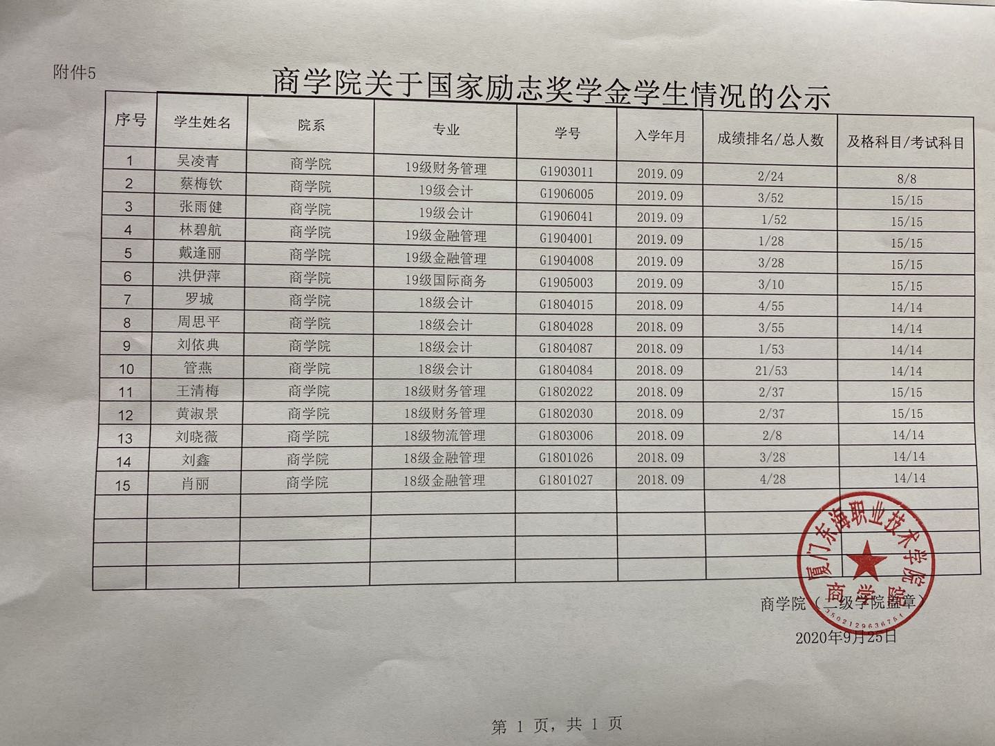 商学院2020年秋 国家励志奖学金学生情况公示