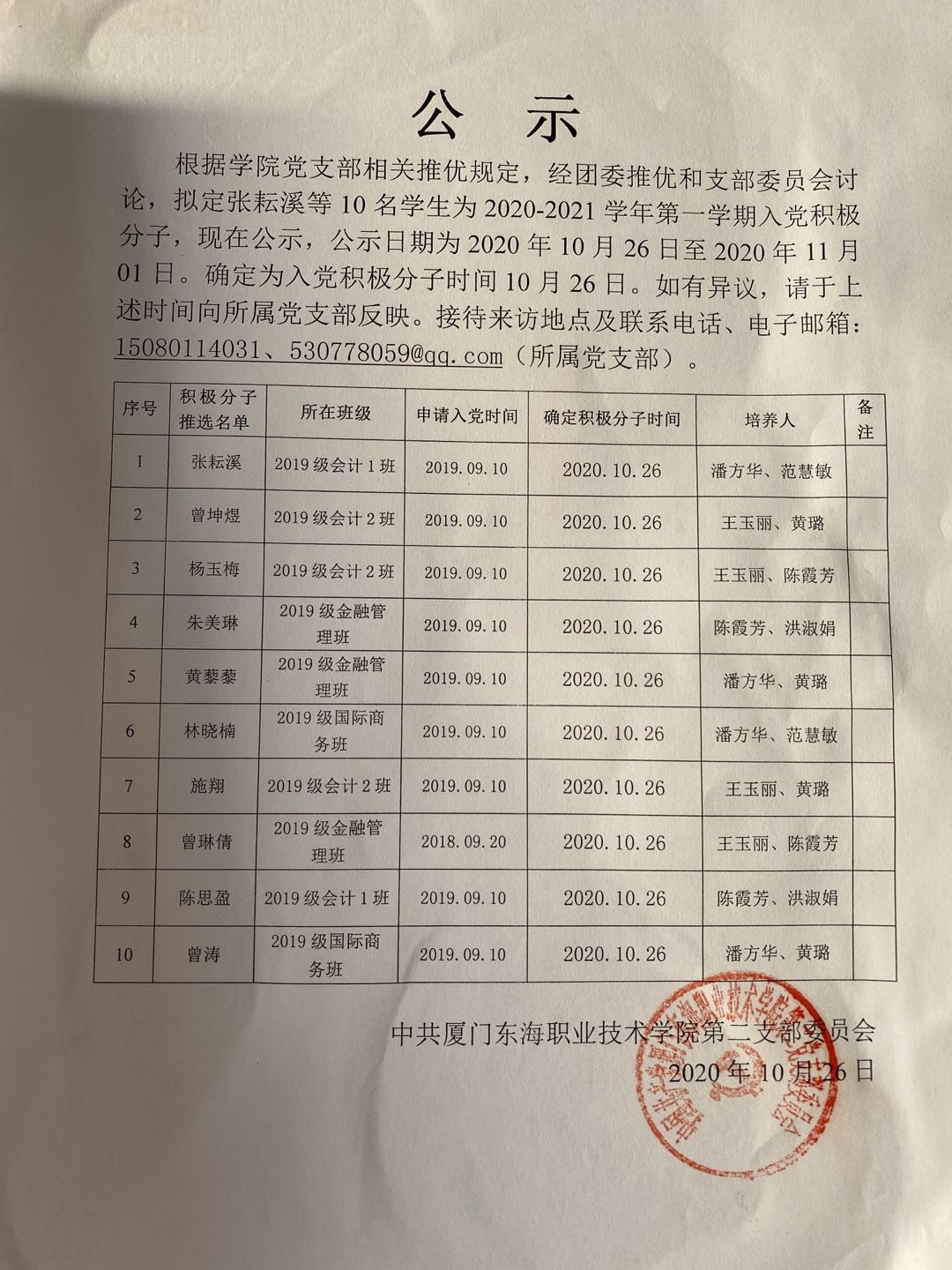 商学院2020年秋关于确定入党积极分子的公示