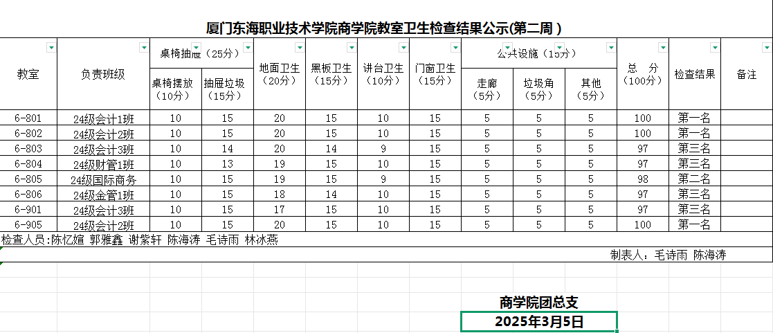 2024-2025学年第二学期商学院第3周班级卫生评比