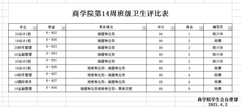 2020-2021年第二学期商学院第十四周班级卫生评比
