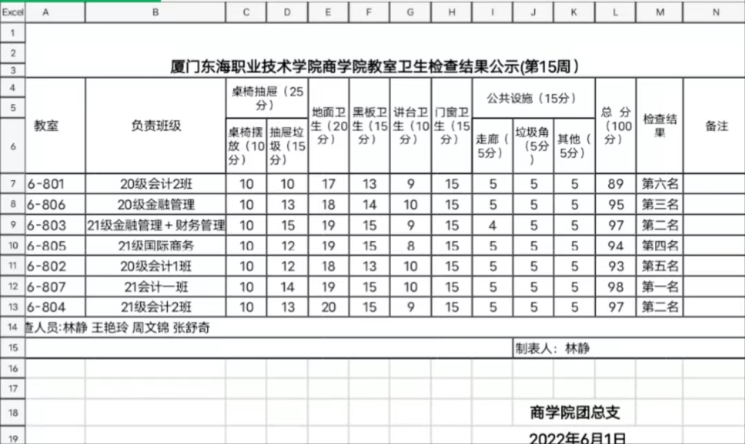 2021-2022年第二学期商学院第十五周班级卫生评比