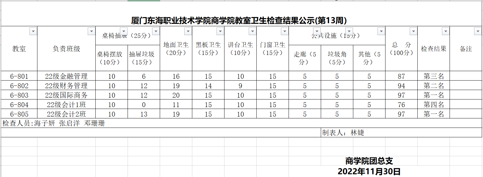 2022-2023学年第一学期商学院第十三周班级卫生评比