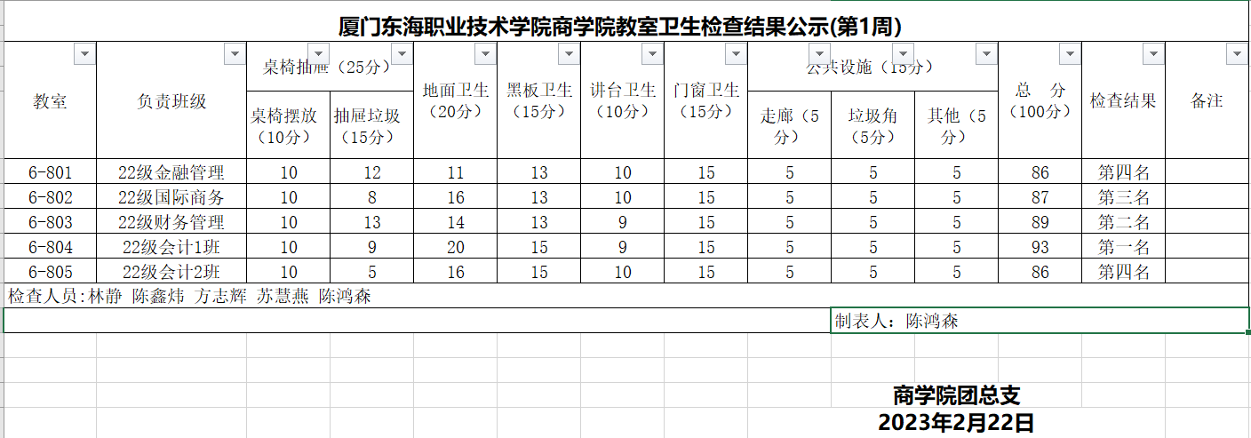 2022-2023学年第二学期商学院第1周班级卫生评比