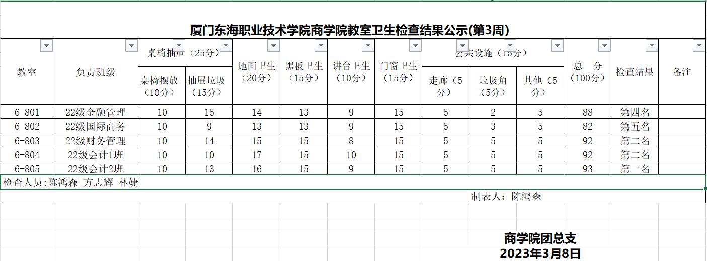 2022-2023学年第二学期商学院第3周班级卫生评比