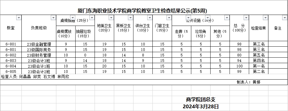 2023-2024学年第二学期商学院第5周班级卫生评比
